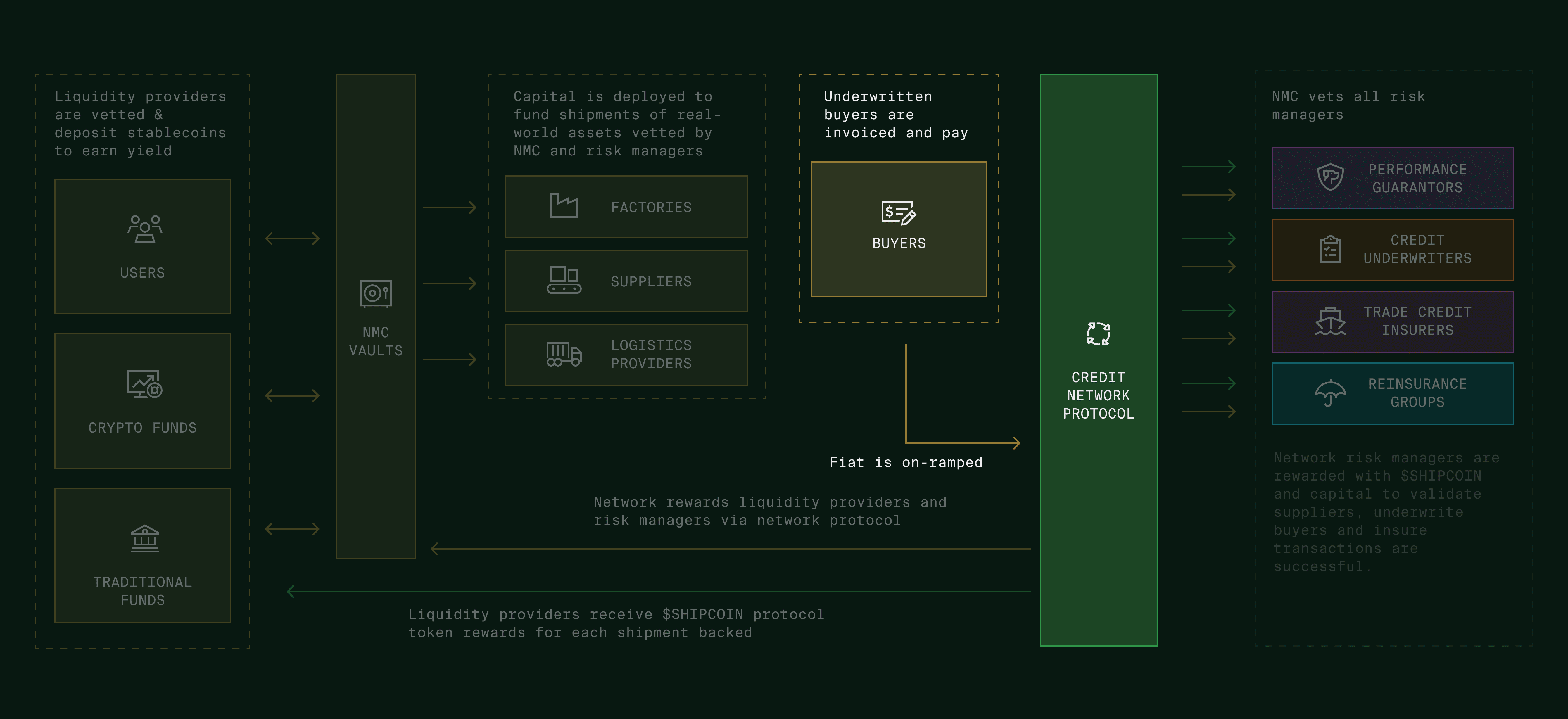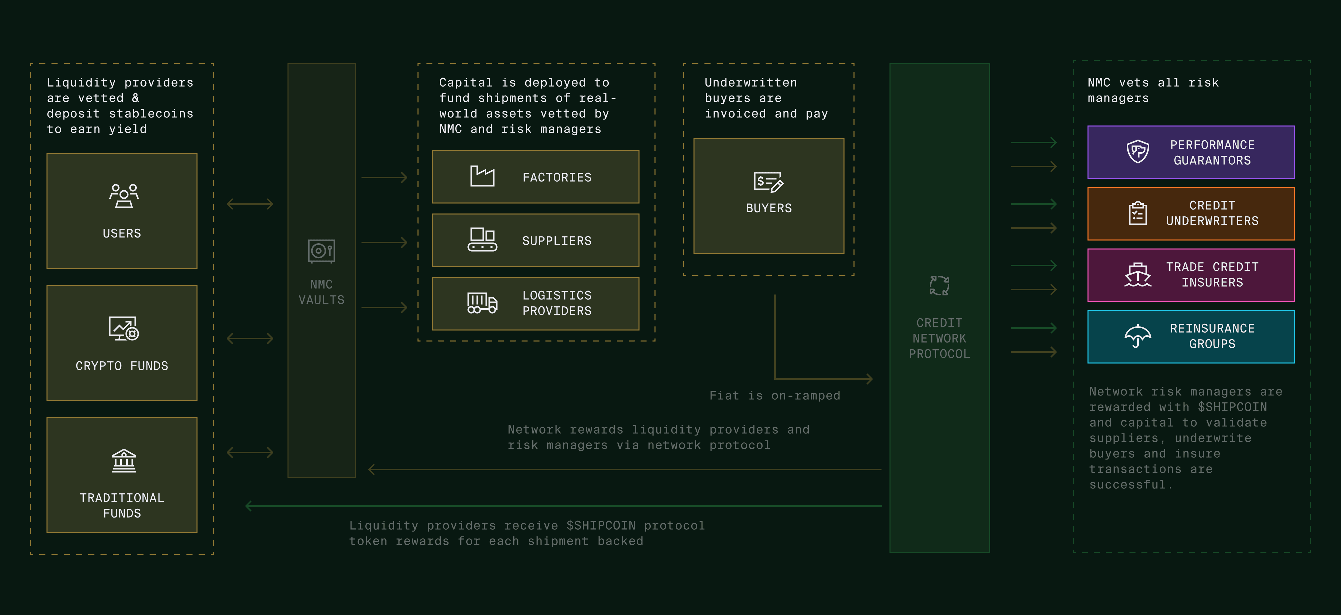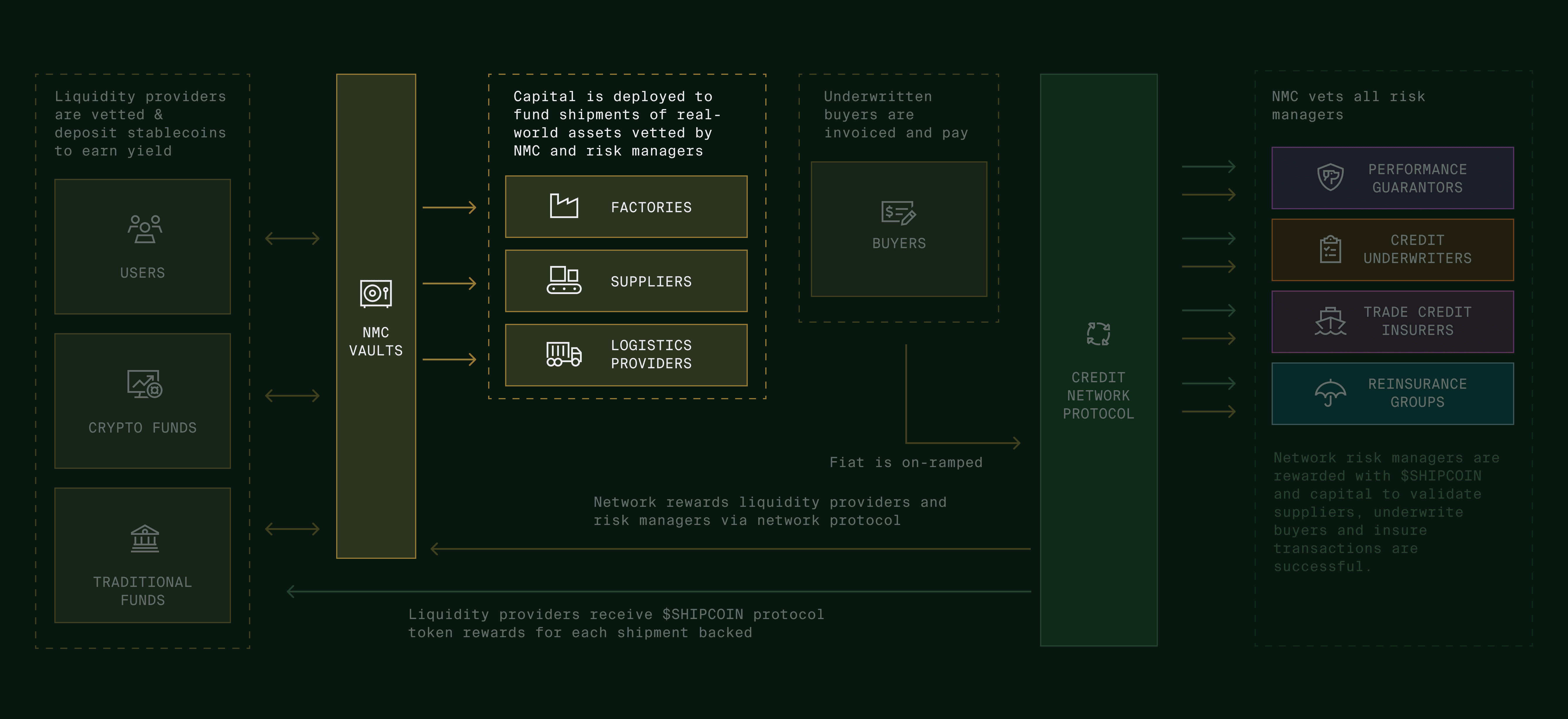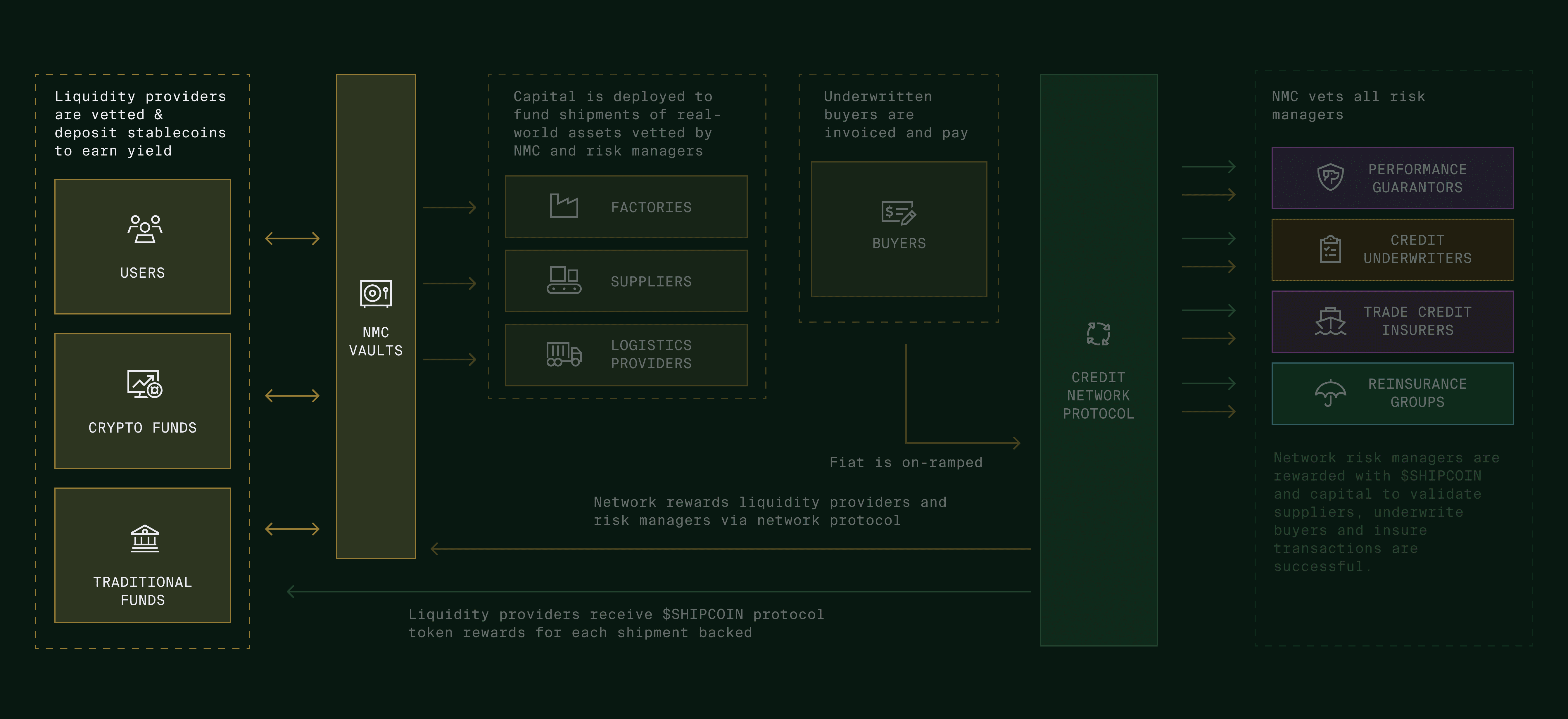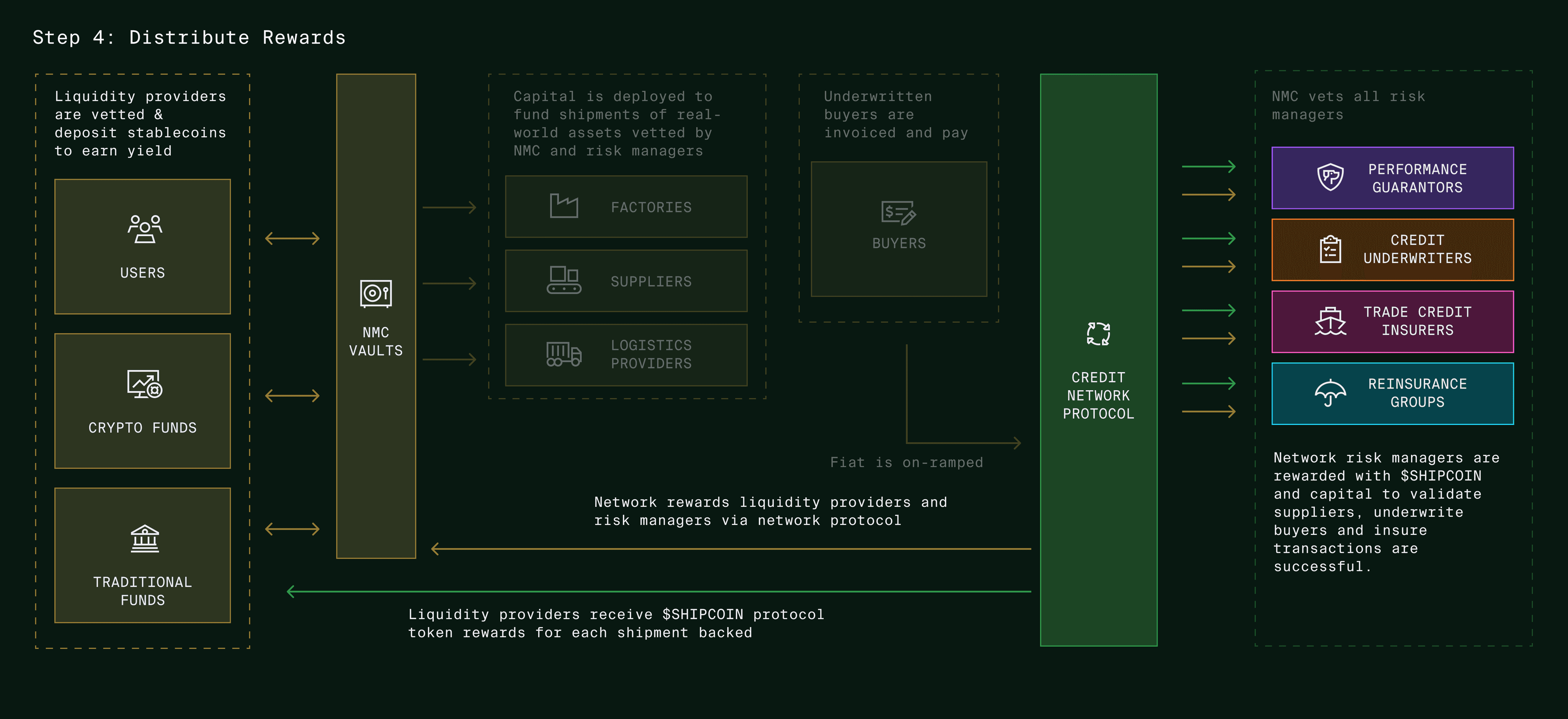 To ensure accuracy, these entities stake capital and $SHIPCOIN in NMCbg, NMCsg, and NMCre vaults. Should they fail to accurate assess risk, both capital and $SHIPCOIN rewards are reduced or eliminated.
