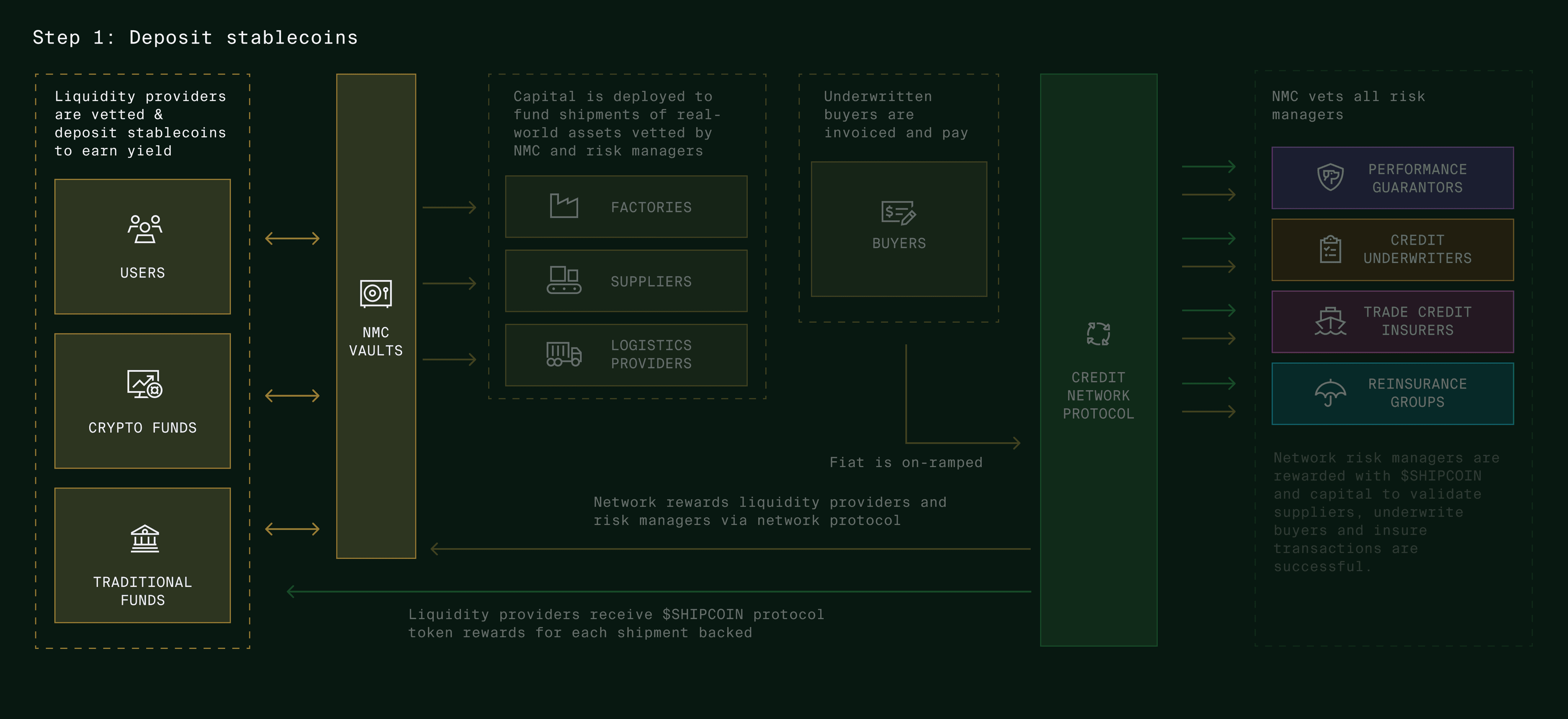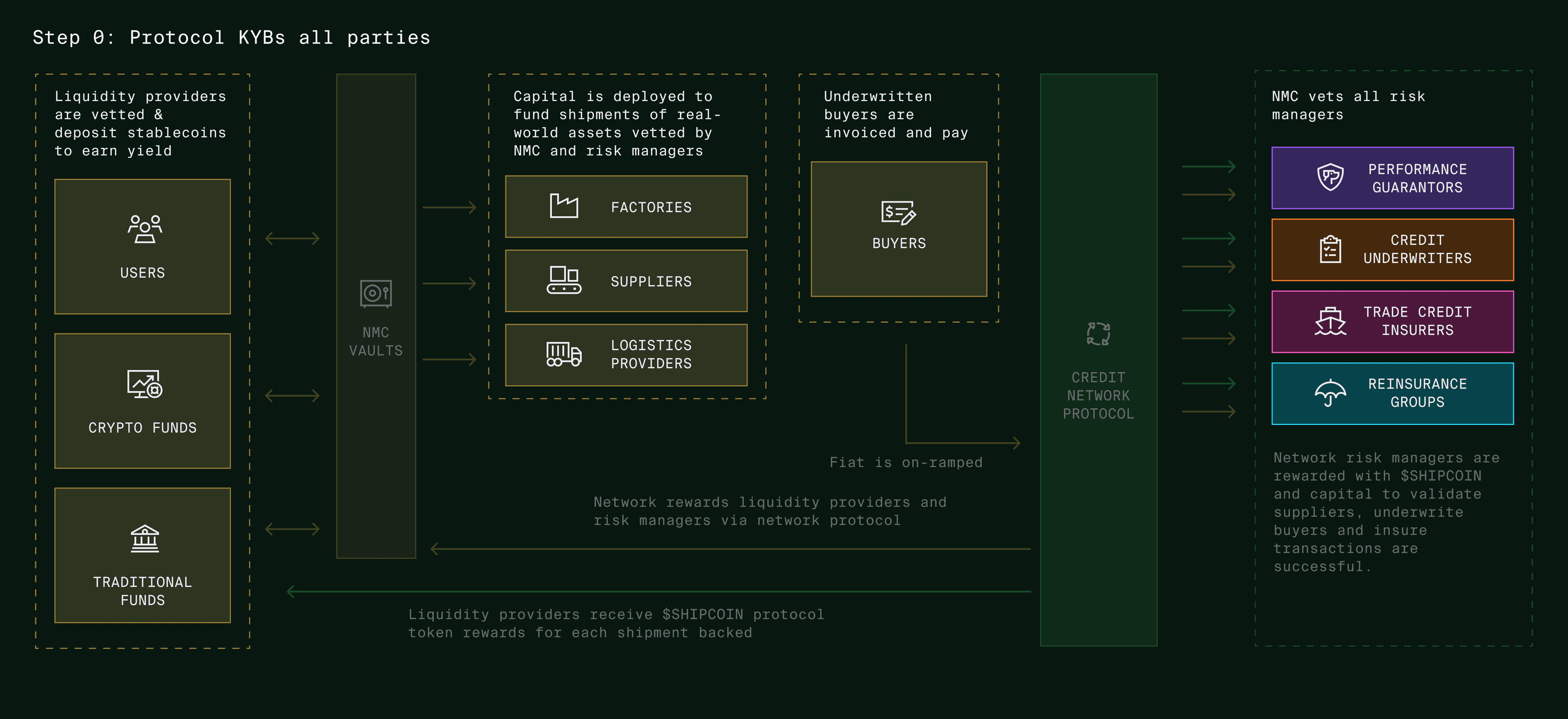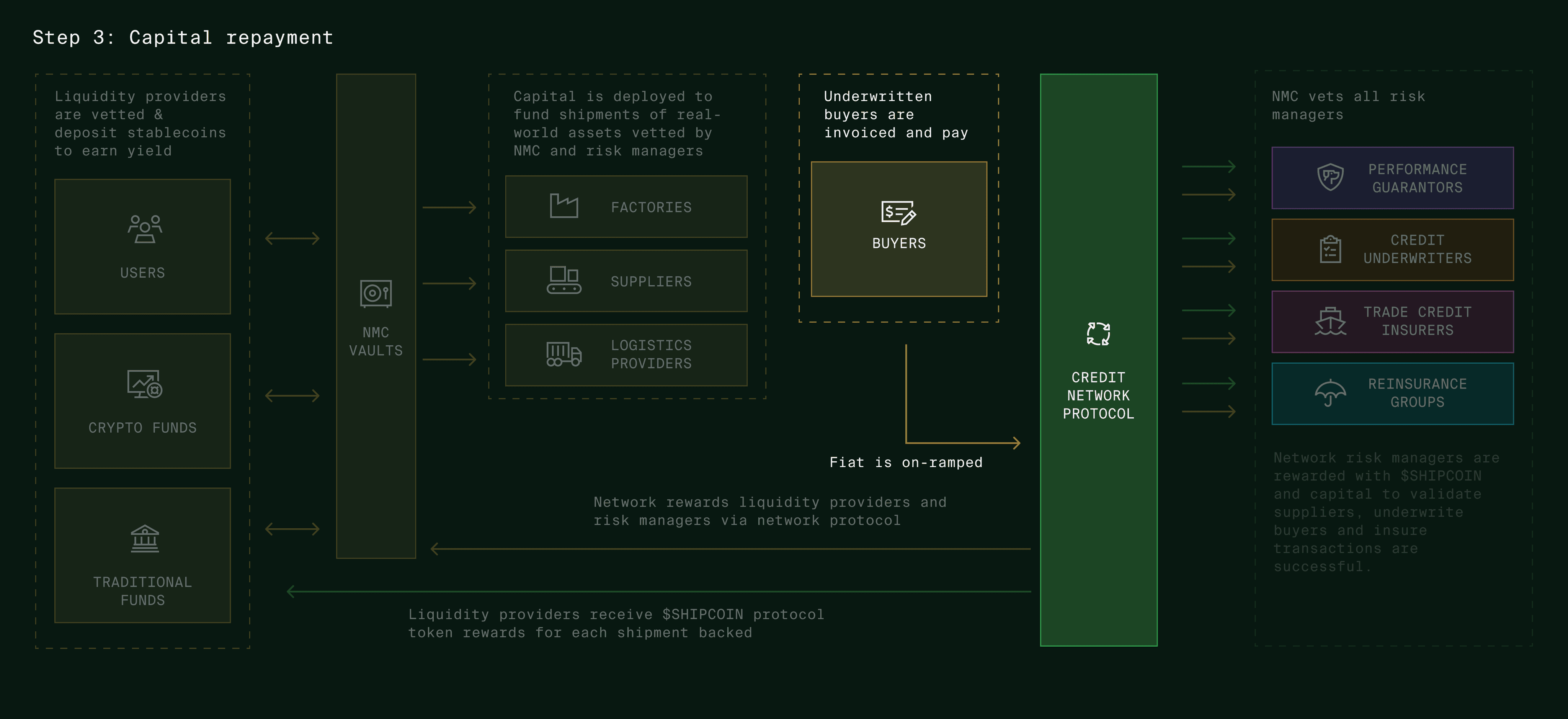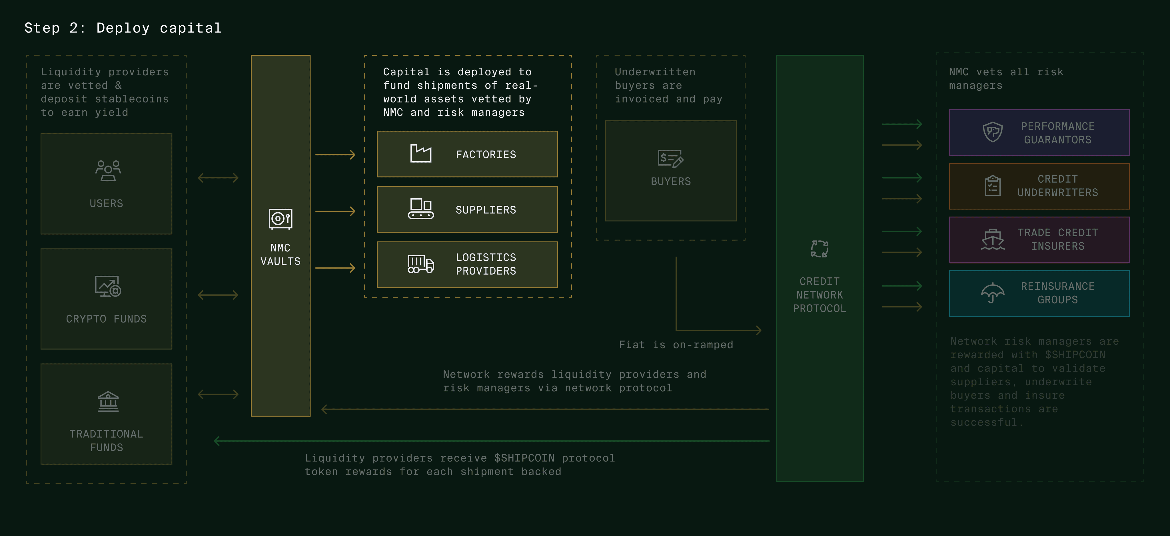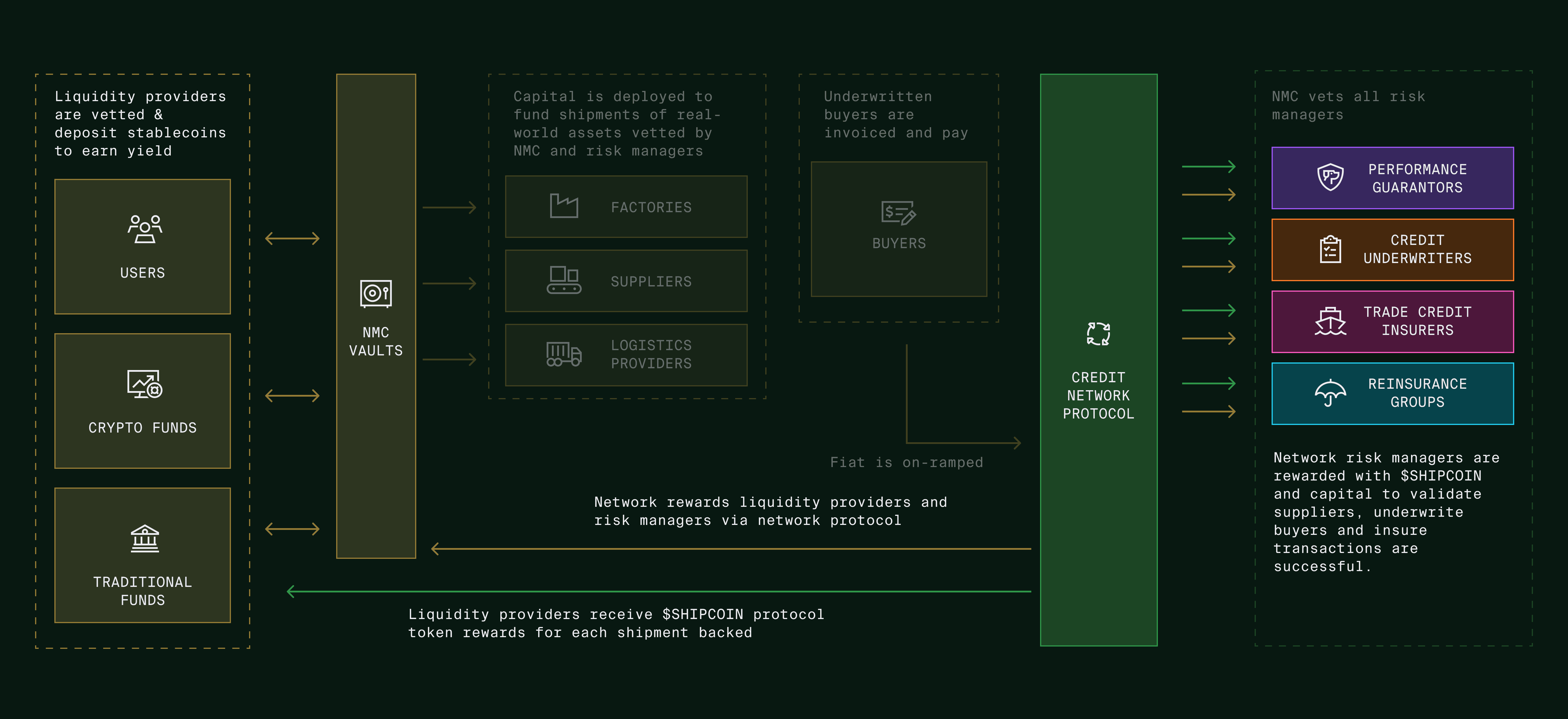 To ensure accuracy, these entities stake capital and $SHIPCOIN in NMCbg, NMCsg, and NMCre vaults. Should they fail to accurate assess risk, both capital and $SHIPCOIN rewards are reduced or eliminated.